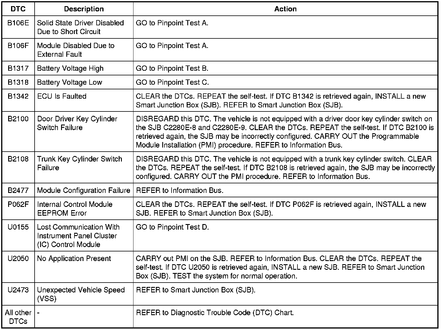 Smart Junction Box (SJB) DTC Chart