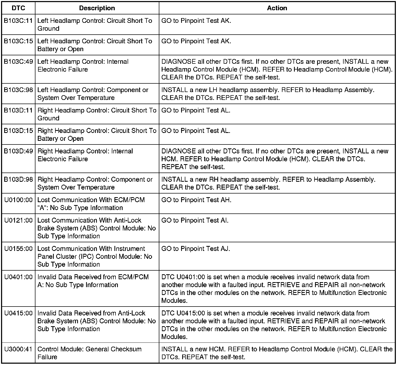 NOTE: This module utilizes a 5-character DTC followed by a 2-character failure-type code. The failure-type code provides information about specific fault conditions such as opens, or shorts to ground. Continuous memory DTCs have an additional 2-character DTC status code suffix to assist in determining DTC history.