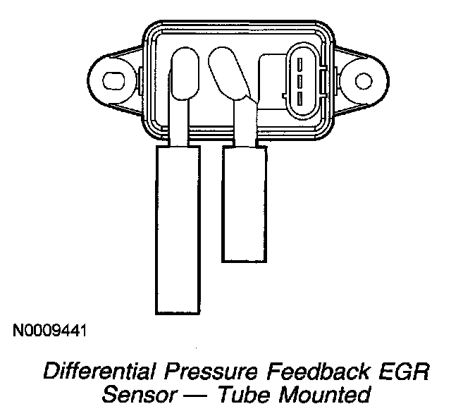 The differential pressure feedback EGR sensor is a piezo resistive type pressure transducer that monitors the differential pressure across a metering orifice located in the orifice tube assembly. The differential pressure feedback EGR sensor receives this signal through 2 hoses referred to as the downstream pressure hose (REF signal) and upstream pressure hose (HI signal). The HI and REF hose connections are marked on the differential pressure feedback EGR sensor housing for identification (note the HI signal uses a larger diameter hose). The differential pressure feedback EGR sensor outputs a voltage proportional to the pressure drop across the metering orifice and supplies it to the PCM as EGR flow rate feedback.