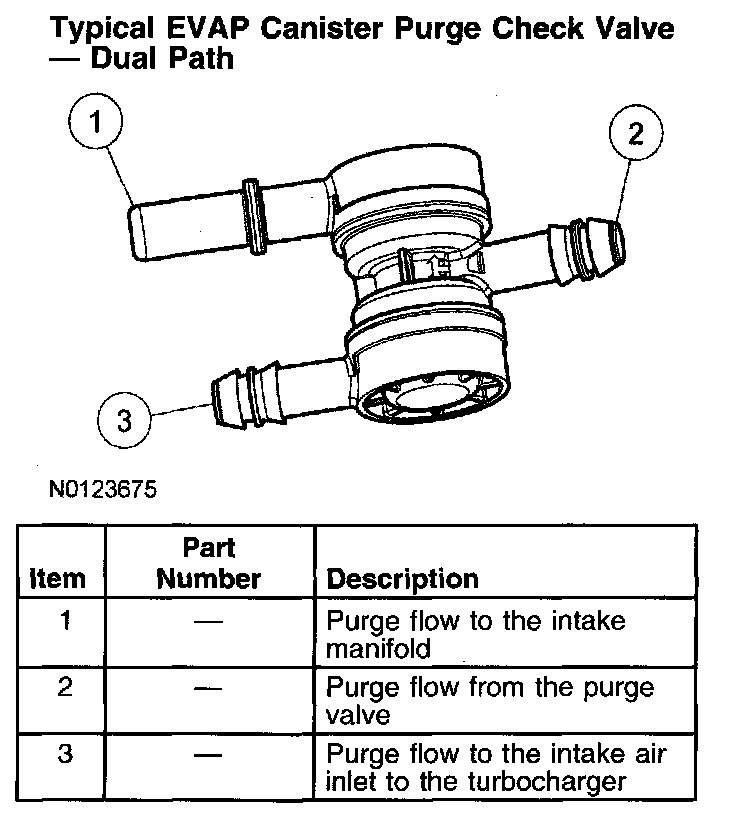 The EVAP canister purge check valve dual path is used to allow purge flow during boost conditions. Fuel vapors flow through the EVAP canister purge check valve to the intake air system upstream of the turbocharger before entering the intake manifold. When the engine is OFF, or at atmospheric pressure, the EVAP canister purge check valve is in an indeterminate state.