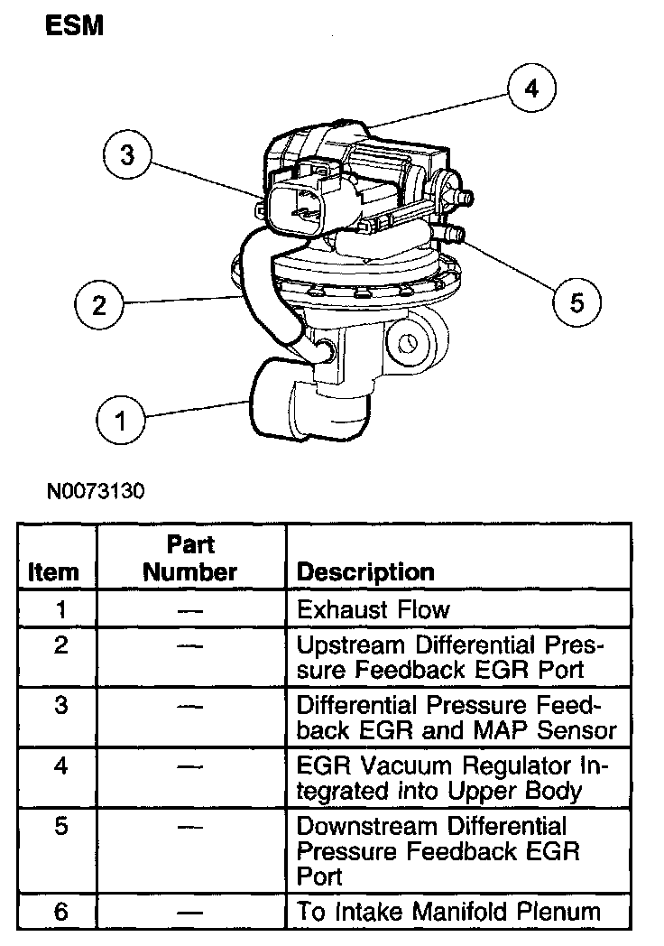 The ESM is an integrated differential pressure feedback EGR system that functions in the same manner as a conventional differential pressure feedback EGR system. The various system components have been integrated into a single component called the ESM. The flange of the valve portion of the ESM bolts directly to the intake manifold with a metal gasket that forms the metering orifice. This arrangement increases system reliability, response time, and system precision. By relocating the EGR orifice from the exhaust to the intake side of the EGR valve, the downstream pressure signal measures manifold absolute pressure (MAP). This MAP signal is used for EGR correction and inferred barometric pressure (BARO) at ignition ON. The system provides the PCM with a differential pressure feedback EGR signal that is identical to a traditional differential pressure feedback EGR system.