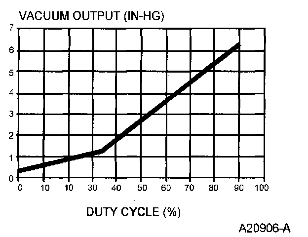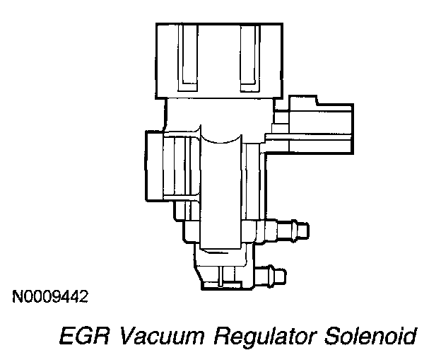 The EGR vacuum regulator solenoid is an electromagnetic device used to regulate the vacuum supply to the EGR valve. The solenoid contains a coil which magnetically controls the position of a disc to regulate the vacuum. As the duty cycle to the coil increases, the vacuum signal passed through the solenoid to the EGR valve also increases. Vacuum not directed to the EGR valve is vented through the solenoid vent to the atmosphere. At 0% duty cycle (no electrical signal applied), the EGR vacuum regulator solenoid allows some vacuum to pass, but not enough to open the EGR valve.