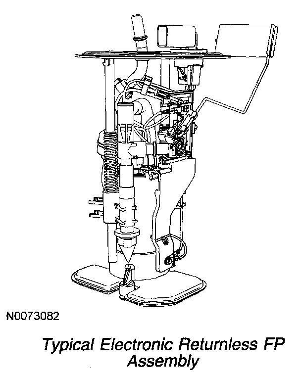 The FP assembly is mounted inside the fuel tank in a reservoir. The pump has a discharge check valve that maintains the system pressure after the ignition has been turned OFF to minimize starting concerns. The reservoir prevents fuel flow interruptions during extreme vehicle maneuvers with low tank fill levels.