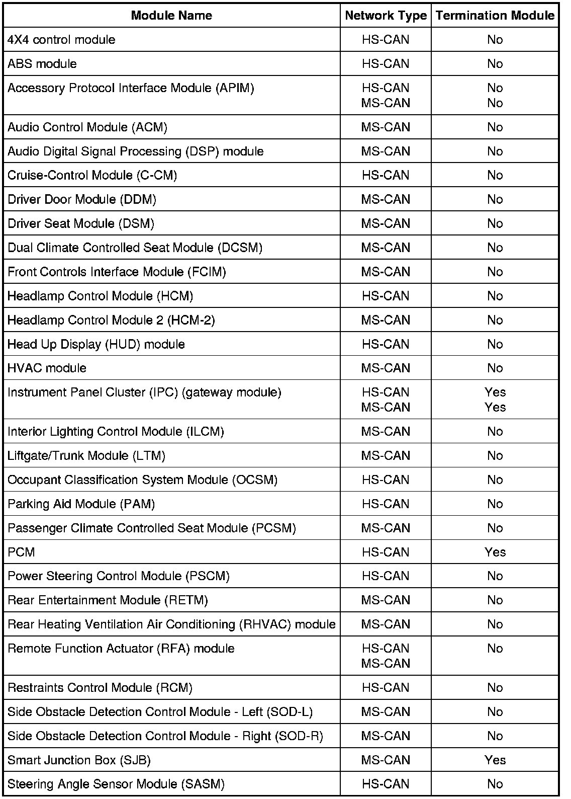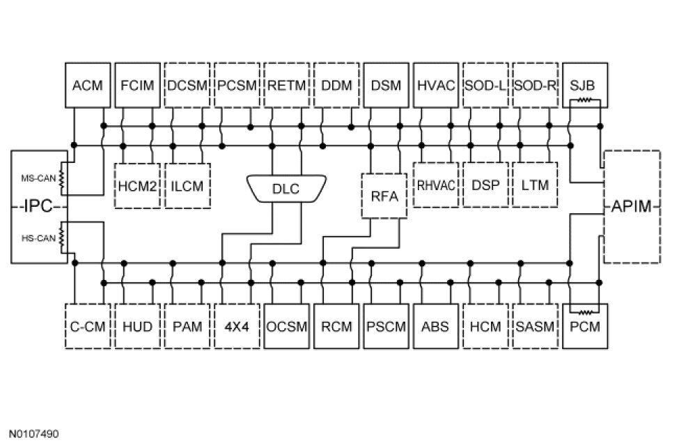 The Instrument Panel Cluster (IPC) is the gateway module, translating messages on the HS-CAN to the MS-CAN and vice versa. This function allows a message to be distributed throughout both networks.