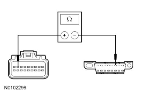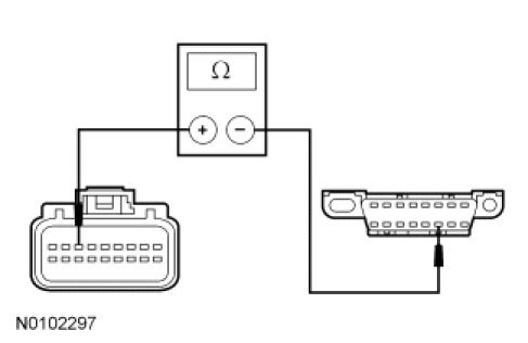 - Measure the resistance between the C-CM C1582-7, circuit VDB05 (WH), harness side and the DLC C251-14, circuit VDB05 (WH), harness side.
