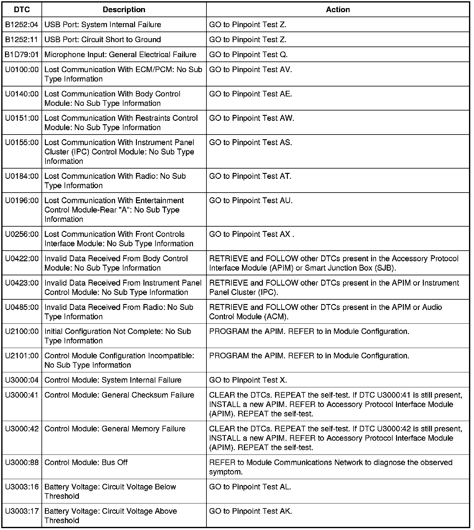 Accessory Protocol Interface Module (APIM) DTC Chart
