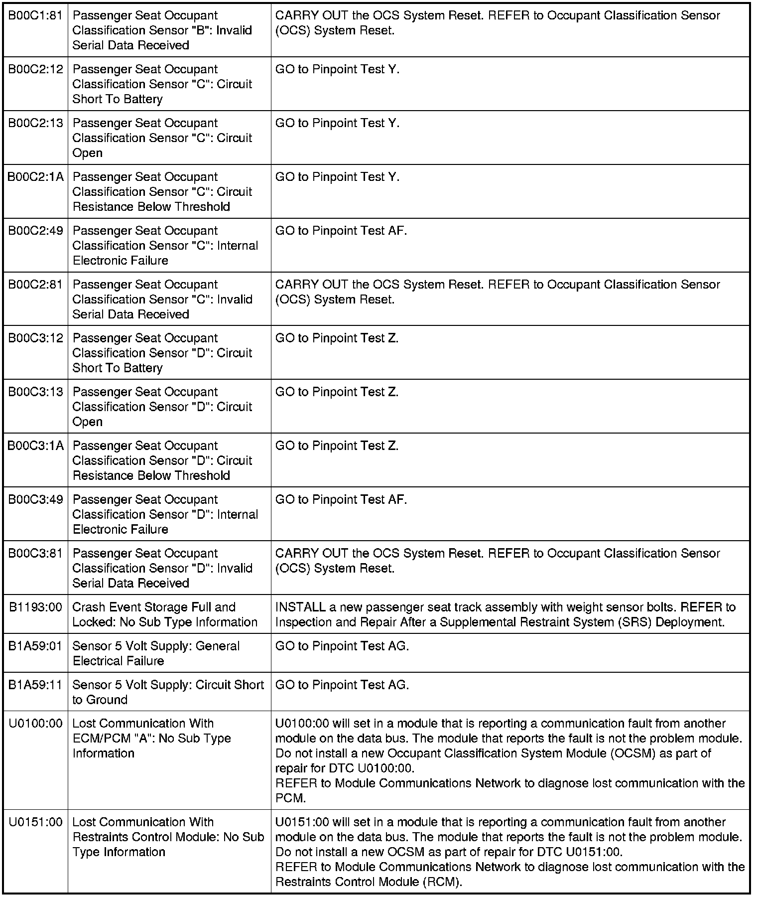 Occupant Classification System Module (OCSM) DTC Chart