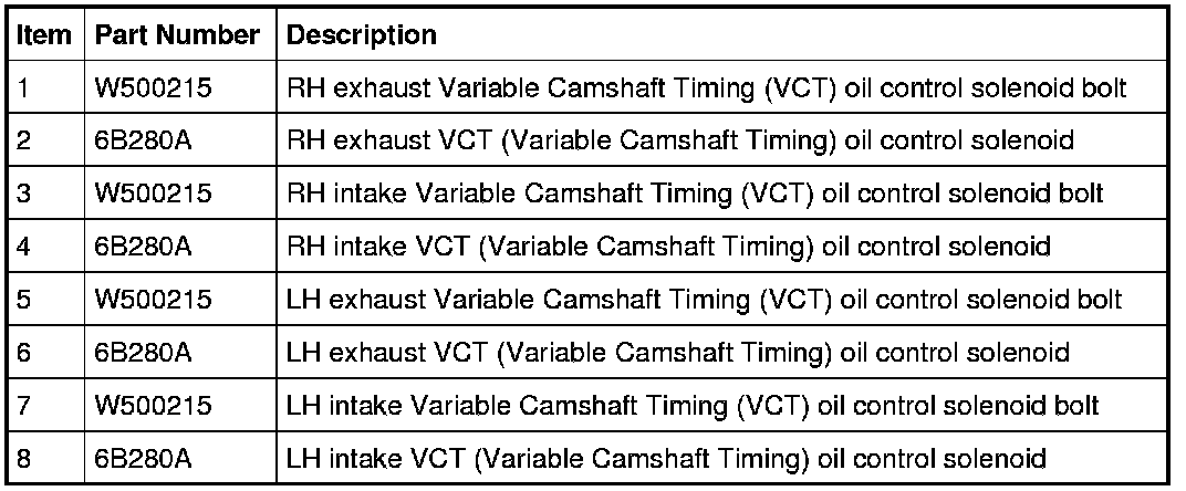 NOTE: The LH and/or RH valve cover must be removed to service the Variable Camshaft Timing (VCT) oil control solenoid. For additional information, refer to Engine for 3.5L engines or 3.7L engines.