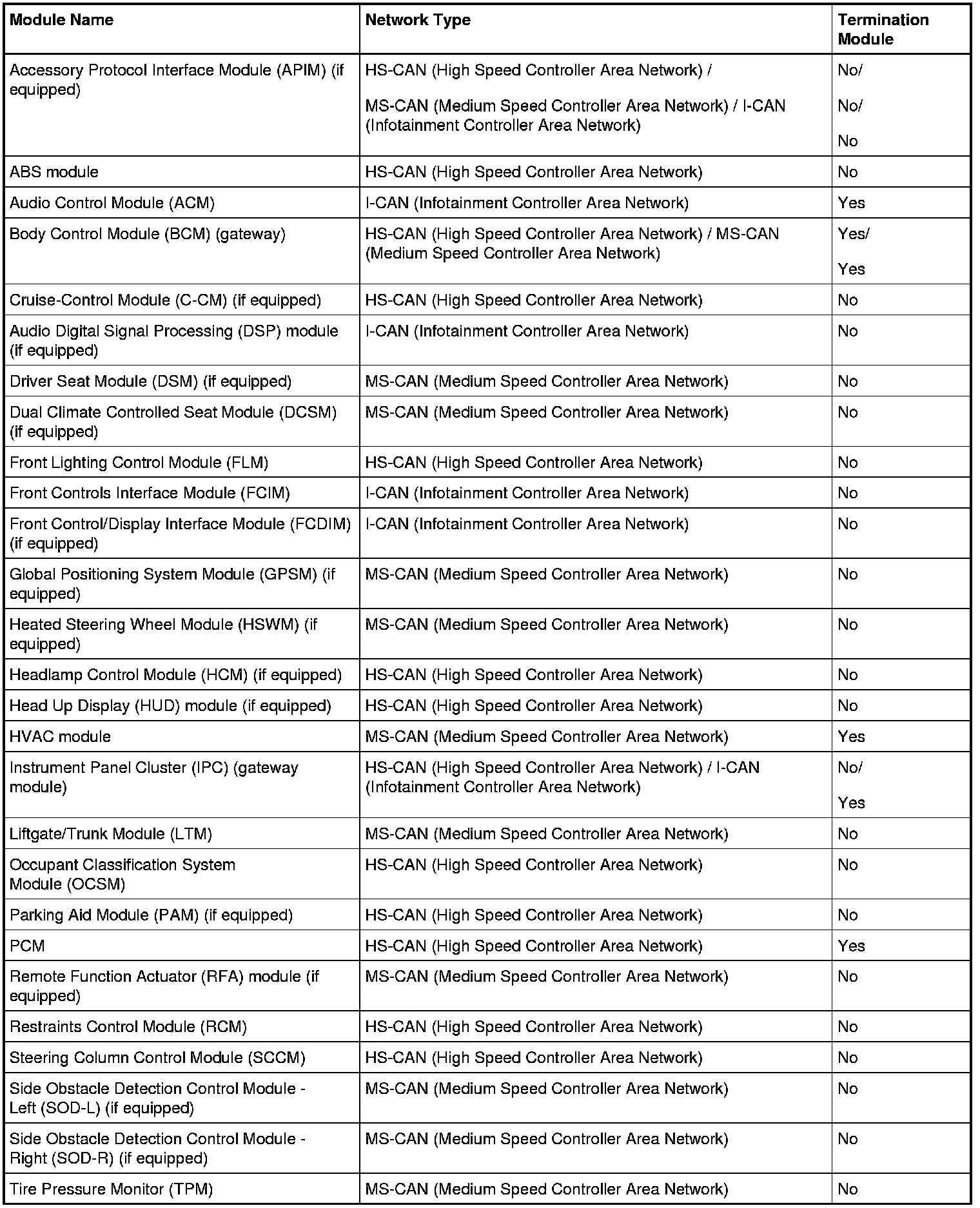 The Instrument Panel Cluster (IPC) and Body Control Module (BCM) are gateway modules. The IPC (Instrument Panel Cluster) translates messages on the HS-CAN (High Speed Controller Area Network) to the I-CAN (Infotainment Controller Area Network) and vice versa. The BCM (Body Control Module) translates messages on the HS-CAN (High Speed Controller Area Network) to the MS-CAN (Medium Speed Controller Area Network) and vice versa. This allows a message to be distributed throughout all three networks.