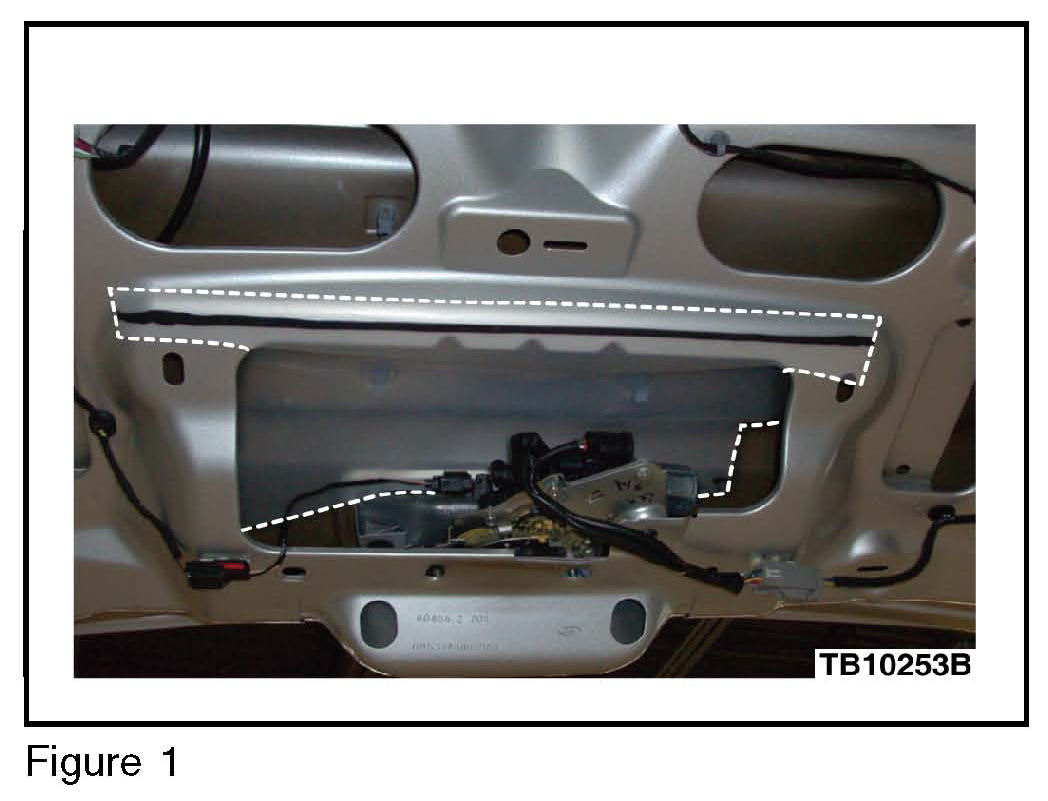 5. Install water deflector. Ensure it is tucked over lifigate latch and lifigate release switch. (Figure 1)