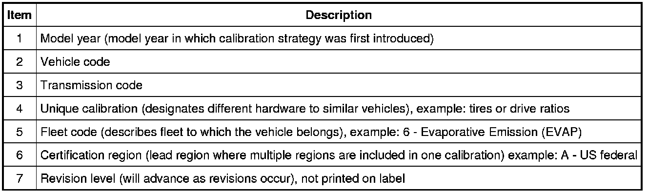 NOTE: Powertrain calibration information is limited to a maximum of 5 characters per line on the Vehicle Certification (VC) label. Because of this, calibration identification consisting of more than 5 characters will wrap to the second line on the VC label.