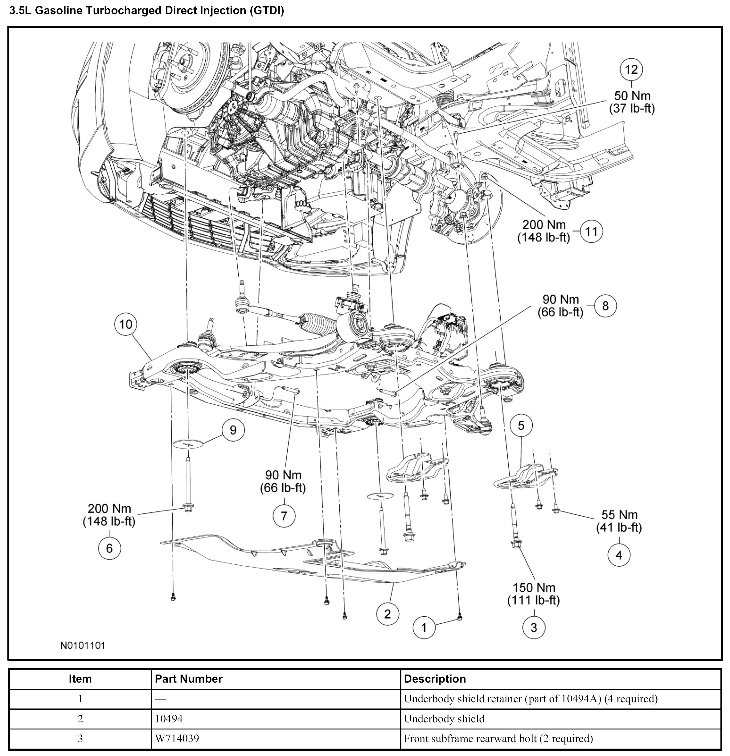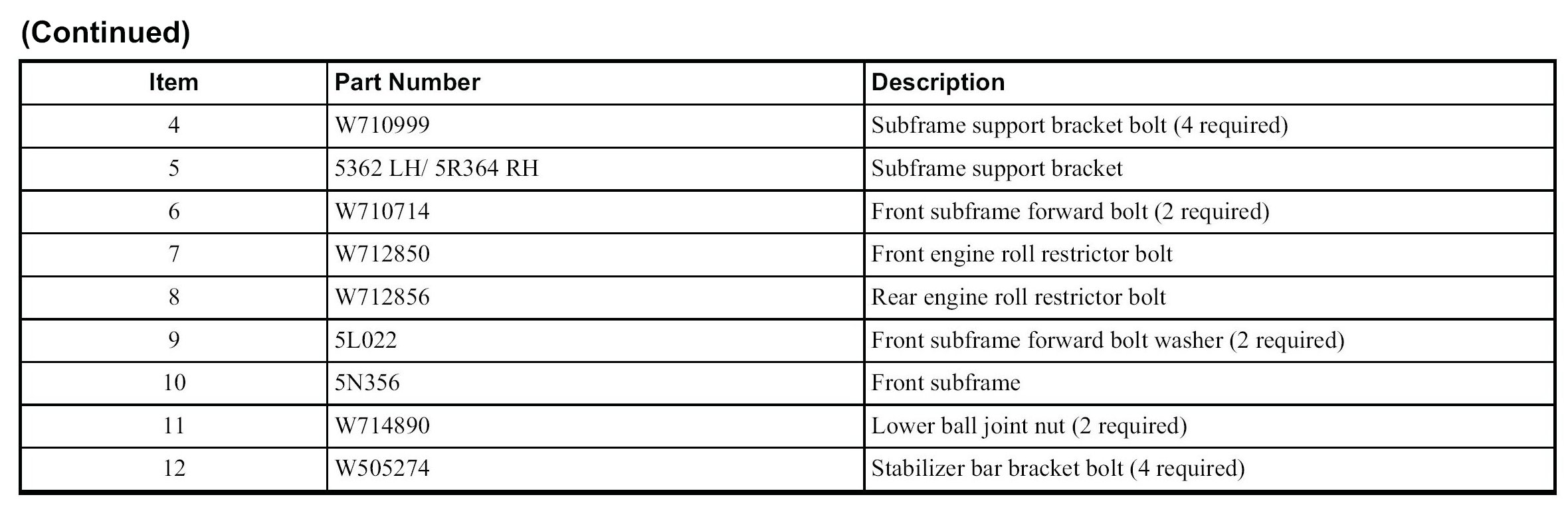 Tighten the 4 new subframe bracket-to-body bolts to 55 Nm (41 lb-ft).