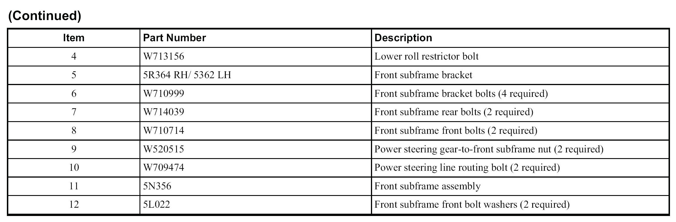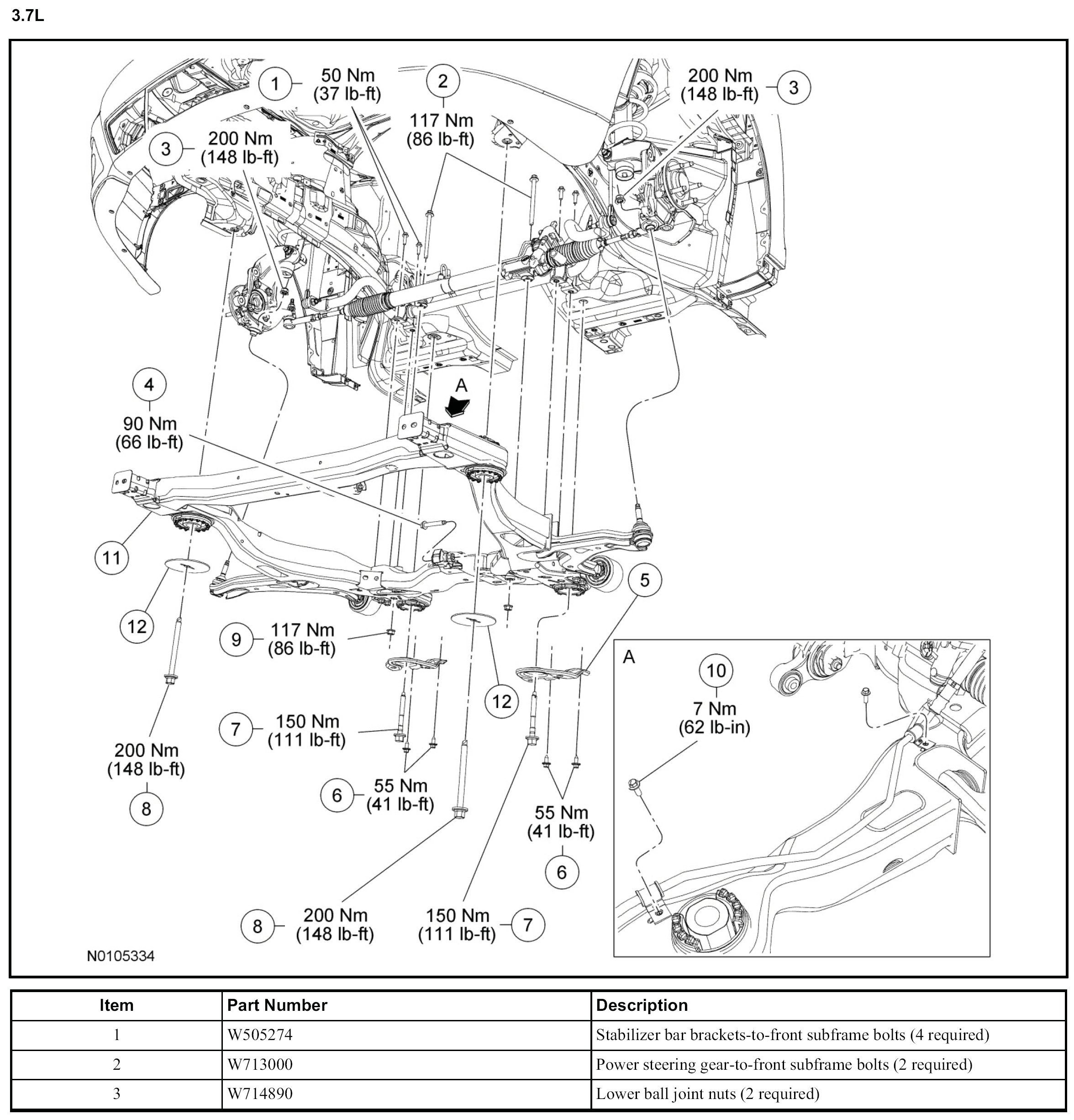Tighten the 4 new subframe bracket-to-body bolts to 55 Nm (41 lb-ft).