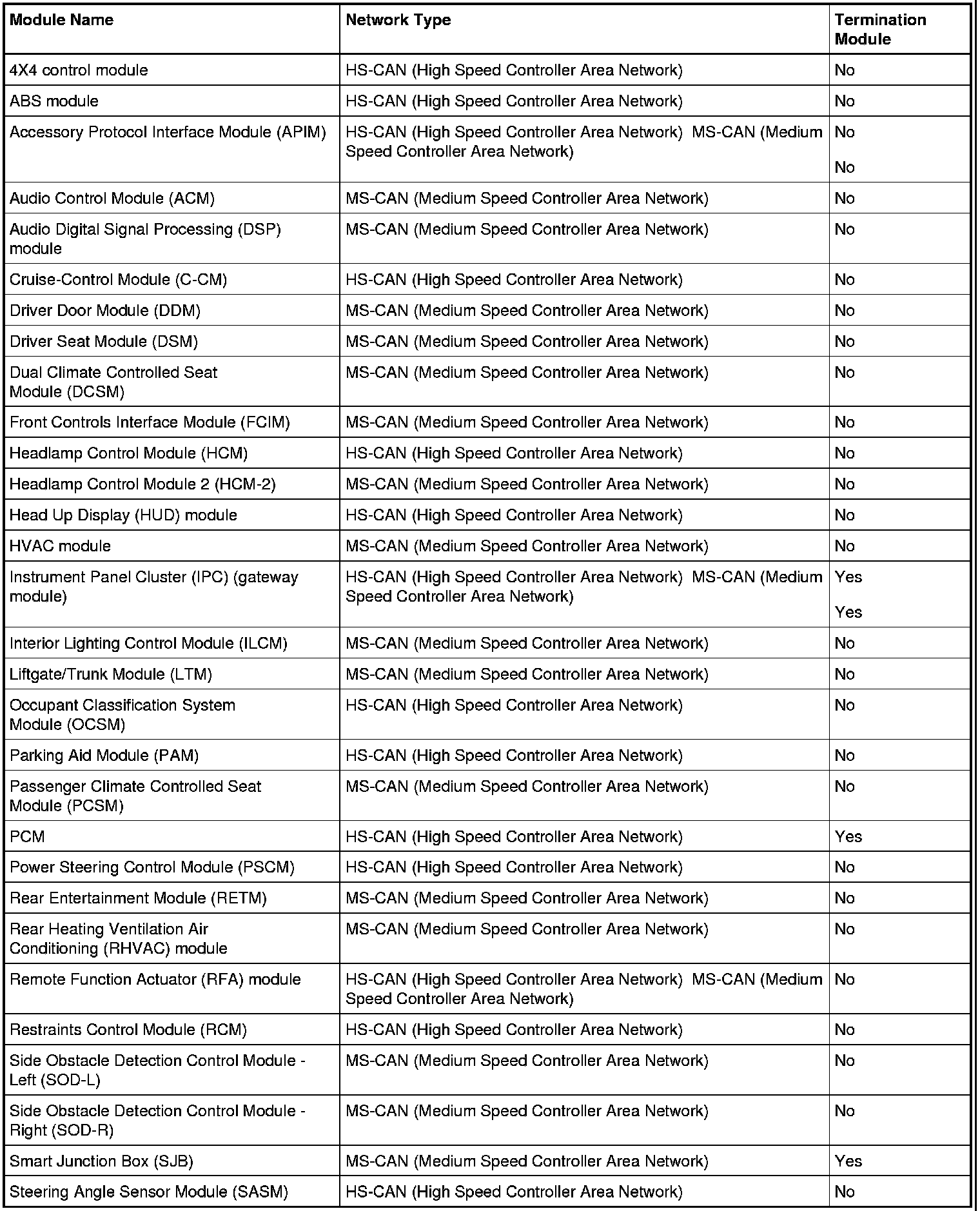The Instrument Panel Cluster (IPC) is the gateway module, translating messages on the HS-CAN (High Speed Controller Area Network) to the MS-CAN (Medium Speed Controller Area Network) and vice versa. This function allows a message to be distributed throughout both networks.