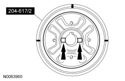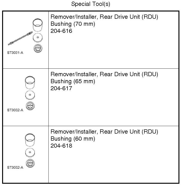 NOTE: When installing the RDU (Rear Drive Unit) bushing, 204-617/2 will fall away as the RDU (Rear Drive Unit) bushing is installed into the subframe. The Rear Drive Unit (RDU) Bushing Remover/Installer does not control the depth of the bushing, continue to tighten the nut until the RDU (Rear Drive Unit) bushing is fully seated into the subframe.