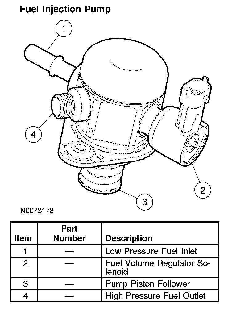 The engine driven fuel injection pump increases fuel rail pressure to the desired level to support fuel injection requirements. Unlike conventional port fuel injection systems, with direct injection the desired fuel rail pressure ranges widely over operating conditions. The pump receives fuel from the fuel pump (FP) assembly, increases the fuel pressure from approximately 448 kPa (65 psi) to a variable pressure up to 15 MPa (2175 psi), and delivers it to the fuel rails. The fuel injection pump is driven by a dedicated intake camshaft lobe and is located on top of the engine.