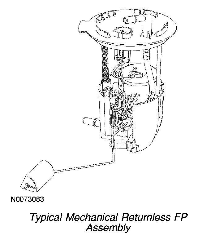 The FP assembly is mounted inside the fuel tank in a reservoir. The pump has a discharge check valve that maintains the system pressure after the ignition has been turned OFF to minimize starting concerns. The reservoir prevents fuel flow interruptions during extreme vehicle maneuvers with low tank fill levels.