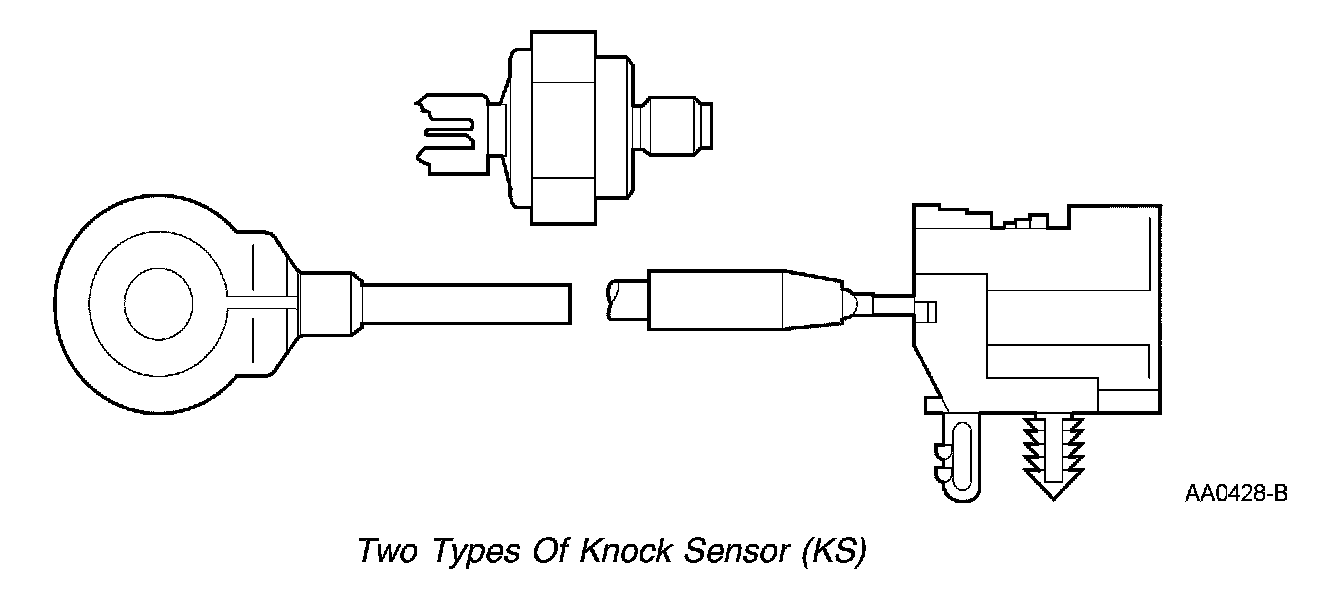 The KS is a tuned accelerometer on the engine which converts engine vibration to an electrical signal. The PCM uses this signal to determine the presence of engine knock and to retard spark timing.