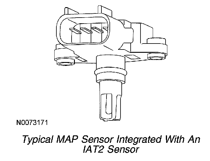 The MAP sensor for speed density control systems is centrally located on the intake manifold and measures the intake manifold pressure. The PCM uses this information to determine the speed density air charge and to provide input for various spark control functions. The MAP sensor for a speed density system is integrated with the IAT2 sensor.