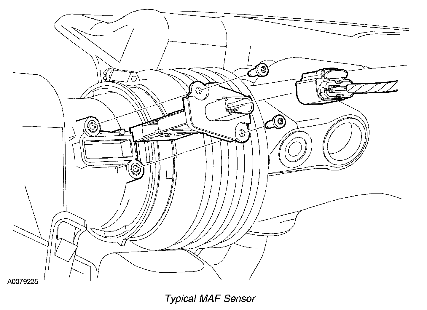 The MAF sensor uses a hot wire sensing element to measure the amount of air entering the engine. Air passing over the hot wire causes it to cool. This hot wire is maintained at 200°C (392°F) above the ambient temperature as measured by a constant cold wire. The current required to maintain the temperature of the hot wire is proportional to the mass airflow. The MAF sensor then outputs a signal to the PCM proportional to the intake air mass. The PCM calculates the required fuel injector pulse width in order to provide the desired air to fuel ratio. This input is also used in determining transmission electronic pressure control (EPC), shift, and torque converter clutch (TCC) scheduling.
