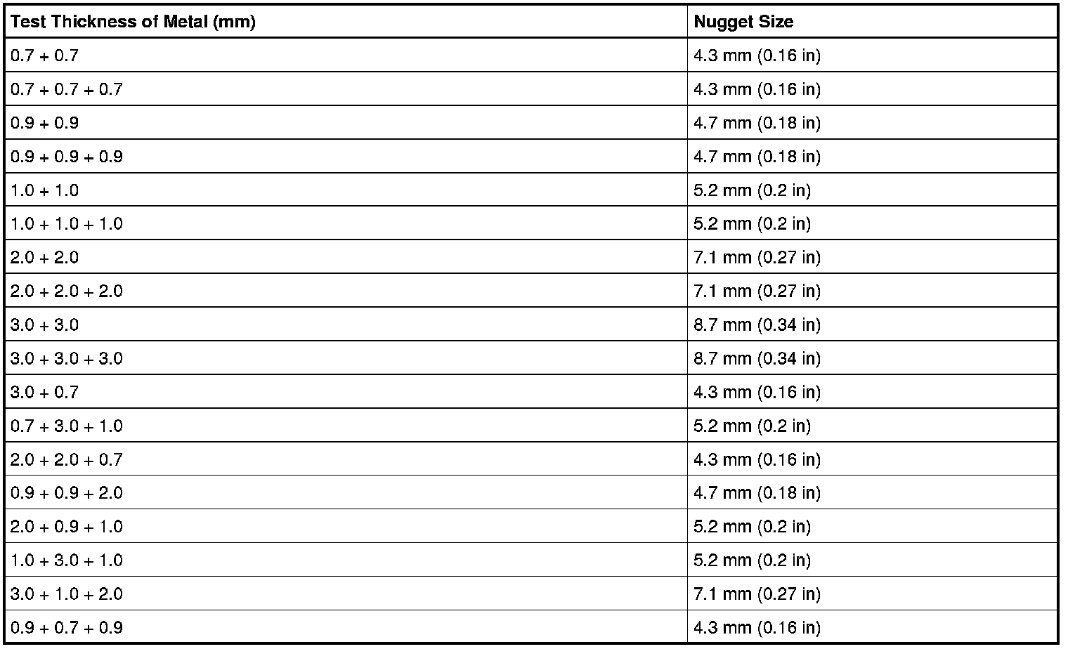 Weld Nugget Chart