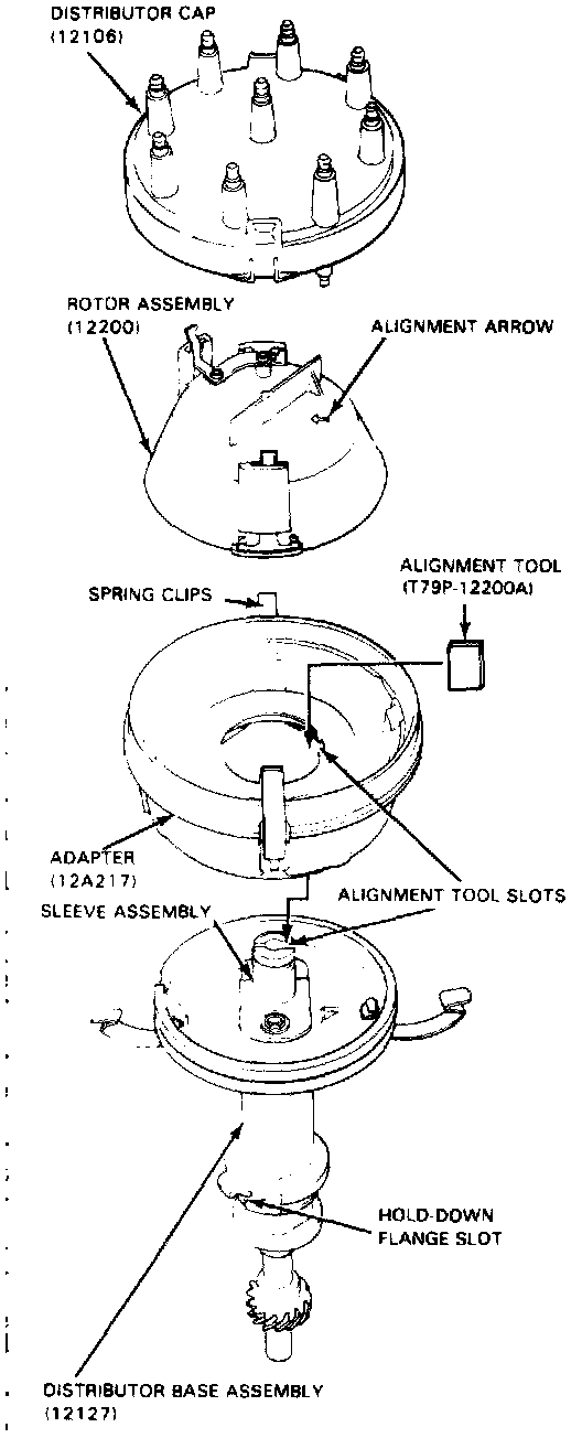2. Position No. 1 piston on compression stroke, then rotate crankshaft until rotor alignment tool, T79P-12200-A or equivalent, can be inserted into alignment slots, Fig. 2.