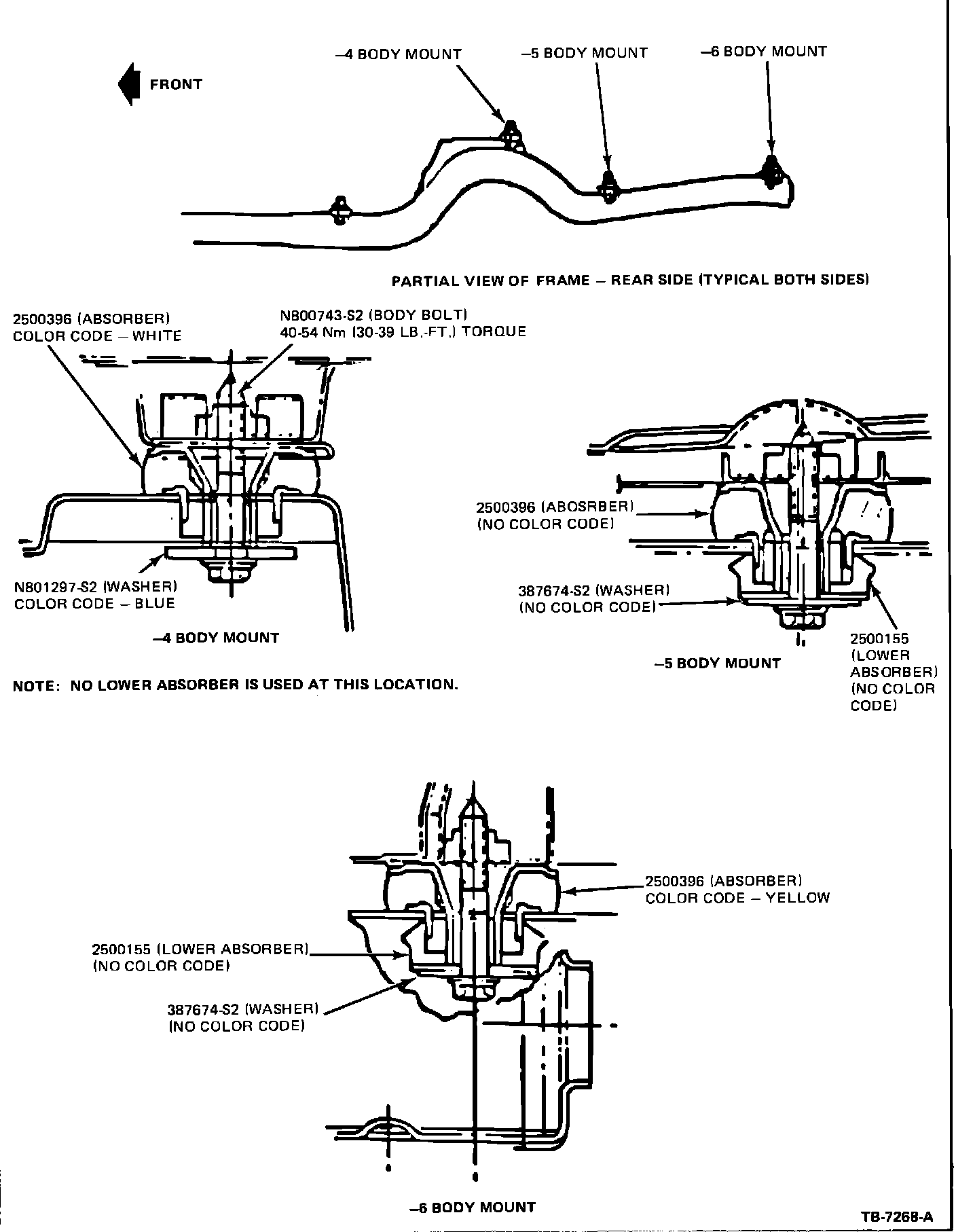 NOTE: The number 4 body mount bolt has a blue coded washer and no lower rubber absorber. The number 5 and 6 bolts have washers not color coded and do have lower rubber absorbers.