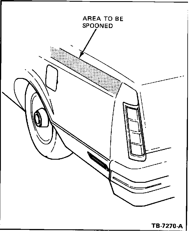 quires a degree of skill in bumping and spooning, it is suggested a body service technician be used. The area to be spooned is the "shelf" or flat area above the character line as shown in Figure 3. The surface of the spoon which will contact the paint must be polished to prevent damage to the paint when striking the spoon with a hammer. Generally, the exact area to be spooned can be determined by placing the spoon on the shelf and applying downward pressure with the palm of your hand. When the spoon is at the correct position, the sheet metal will visibly flex at the crease or dished area.