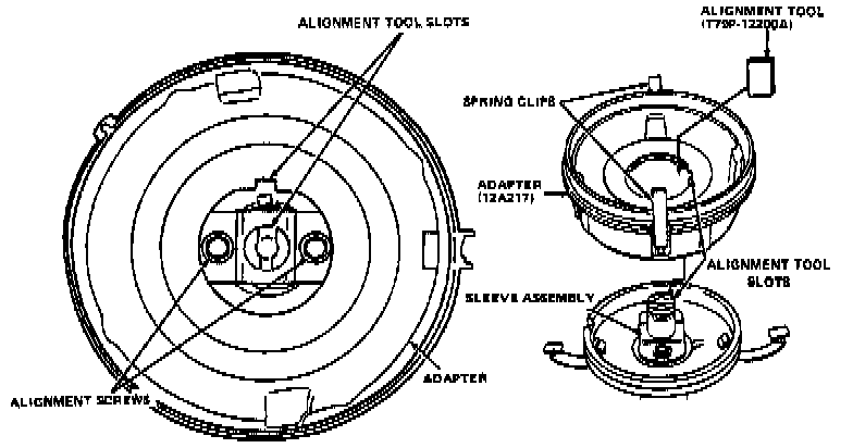 3. Check vibration damper and timing pointer alignment marks. If timing pointer is within ±4° of TDC, alignment is satisfactory. If alignment is out of specifications, position vibration damper at TDC with cylinder No. 1 at TDC. Loosen sleeve assembly adjustment screws and rotate sleeve until rotor alignment tool can be inserted into alignment slots. Fig. 11. Torque adjustment screws to 25---35 in. lbs. and remove tool.