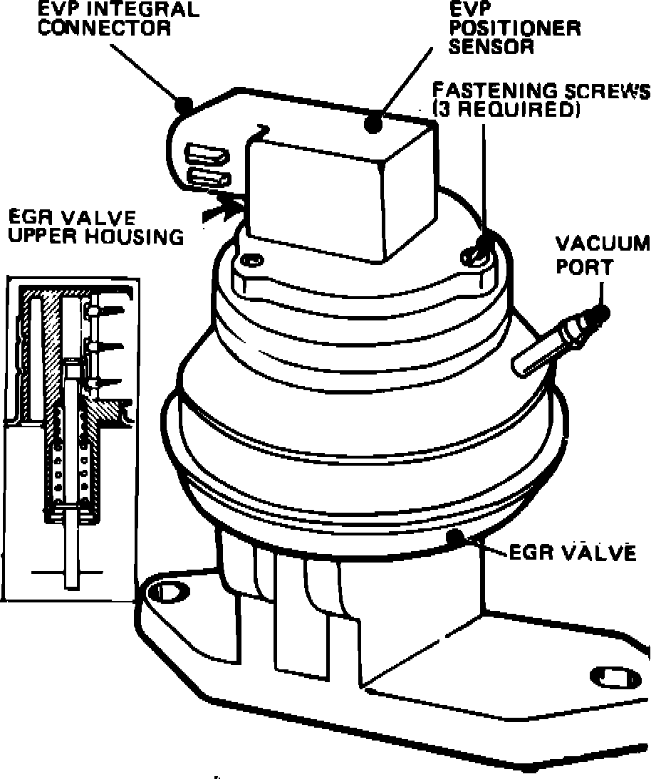 This sensor, Fig. 6, is used to monitor the EGR valve pintle position. The computer applies a reference voltage to the EVP sensor, and the resulting signal from the EVP sensor is proportional to the amount of exhaust gases flowing through the EGR valve pintle into the intake manifold. Depending on the input from this and other sensors, the computer can increase or decrease EGR flow by activating or deactivating a pair of solenoid vacuum valves.