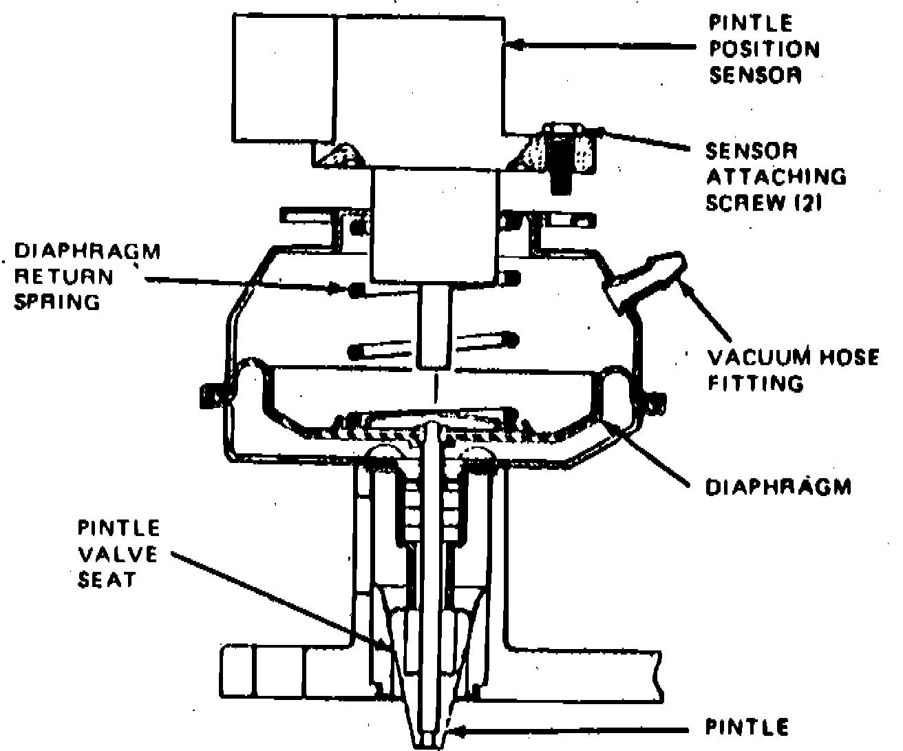 The EGR valve is attached to the intake manifold under the carburetor. The valve controls the flow of gases through a tapered pintle valve and seat. A position sensor attached to the valve provides an electrical signal to the ECA which indicates EGR valve position.