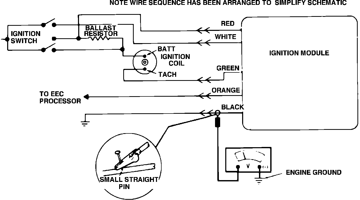 1. With ignition ``Off,'' install straight pin in module black wire, Fig. 9. Do not allow straight pin to touch engine ground.