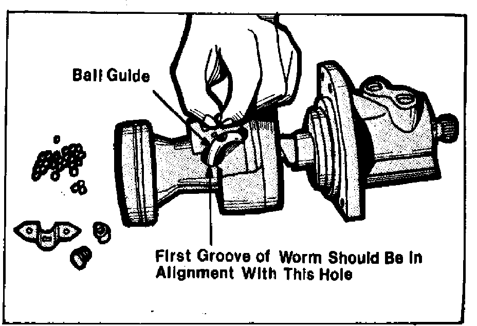 5. Place ball guide into piston. Place balls in guide, turning worm clockwise (viewed from input end of shaft). If all balls have not been fed into guide upon reaching right stop, rotate input shaft in one direction and then in the other while installing balls. After balls have been installed, do not rotate input shaft or piston more than 3{1-2} turns off the right stop to prevent balls from falling out of circuit. The number of balls used varies with the design of the piston.
