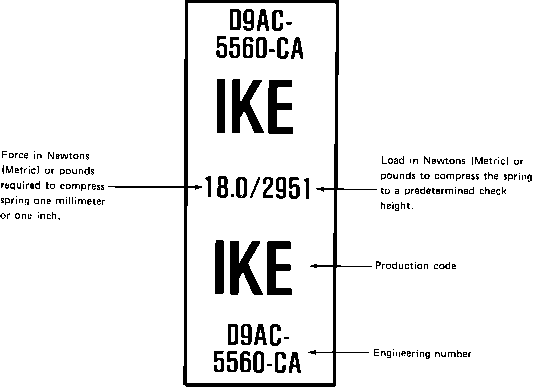 The load indicated on the spring tag is a nominal load to obtain a predetermined check height. The spring, however is designed to operate over a range of loads. The rate is the weight required to compress the spring one millimeter or one inch. Under no circumstances, except where specified, should springs of unequal rates be used together as pairs (side-to-side). Spring pairs however will be of different rates front to rear.