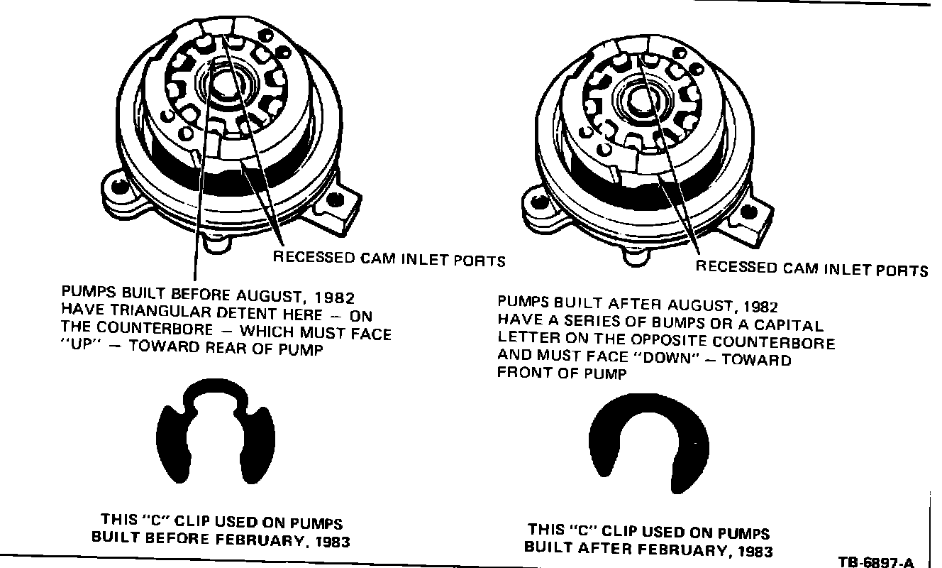 Since August, 1982, the small triangular detent on the rotor of CII power steering pumps has been eliminated. See Figure 11. This mark is used to identify the side of the rotor that must face up when re-assembling the pump. Pumps built since August have rotors with a series of bumps or a capital letter on the opposite side of the rotor. These marks must face down when reassembling the pump or the rotor shaft "C" clip will not install and the rotor will have to be pulled, turned and the springs and slippers re-installed. Dimensionally, these rotors are the same. However, for assembly purpose, it is important that when a rotor has a triangular detent, the mark be up and when it has any other identification, the mark must be down.