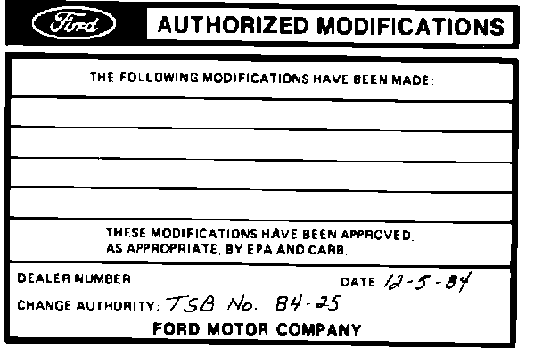 Obtain an Authorized Modifications decal and list the date, dealer number and summary of alterations performed. Select a prominent place adjacent to the Vehicle Emission Control Information decal suitable for installing the Authorized Modifications decal. Clean the area, install the decal and cover it with a clear plastic decal shield.