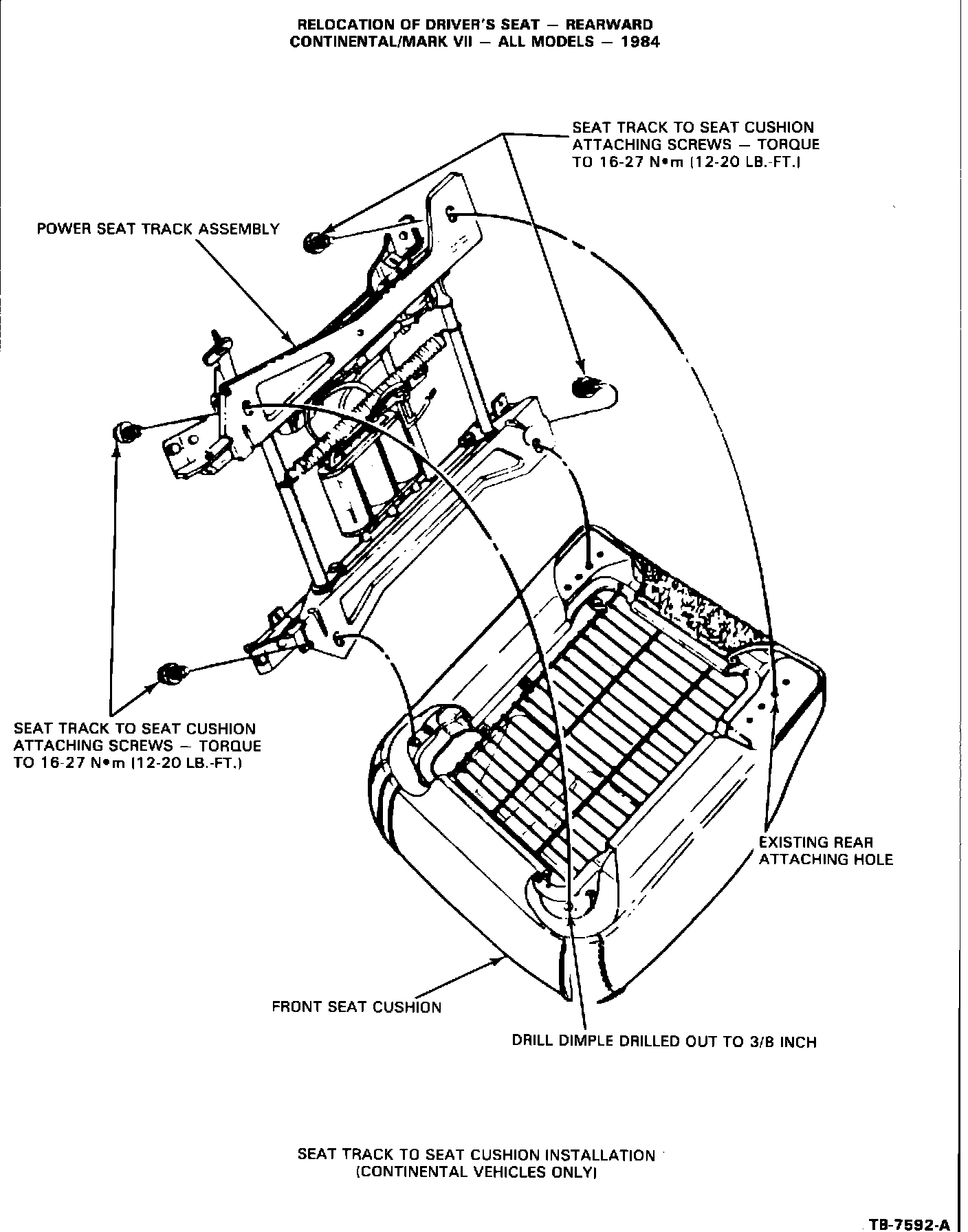 16. Install the seat and track assembly in the vehicle using the previously removed screws and/or nut and washer assemblies. Refer to Group 41-08 of the appropriate 1984 Car Shop Manual.