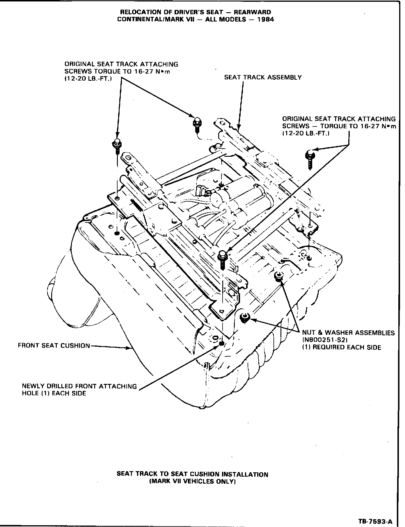 9. Secure the seat track to the seat cushion frame using the four (4) previously removed attaching screws. For Mark VII units install the two (2) nut and washer assemblies (N800251-S2) at the front attachments. Torque the attachments to 16-27 N-m (12-20 ft.lbs.).
