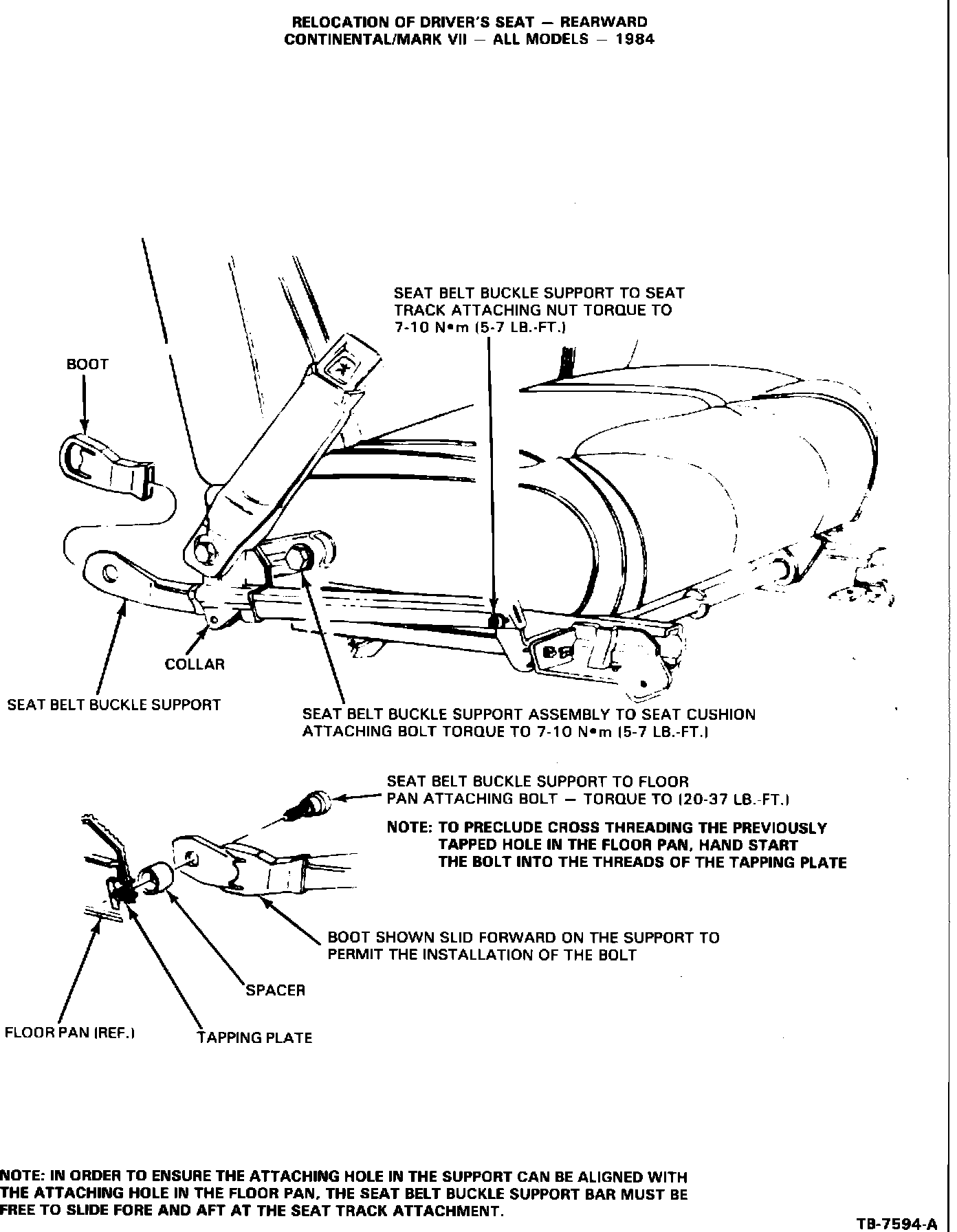 NOTE: In order to ensure the attaching hole in the support can be aligned with the attaching hole in the floor pan, the seat buckle support bar must be free to slide fore and aft.