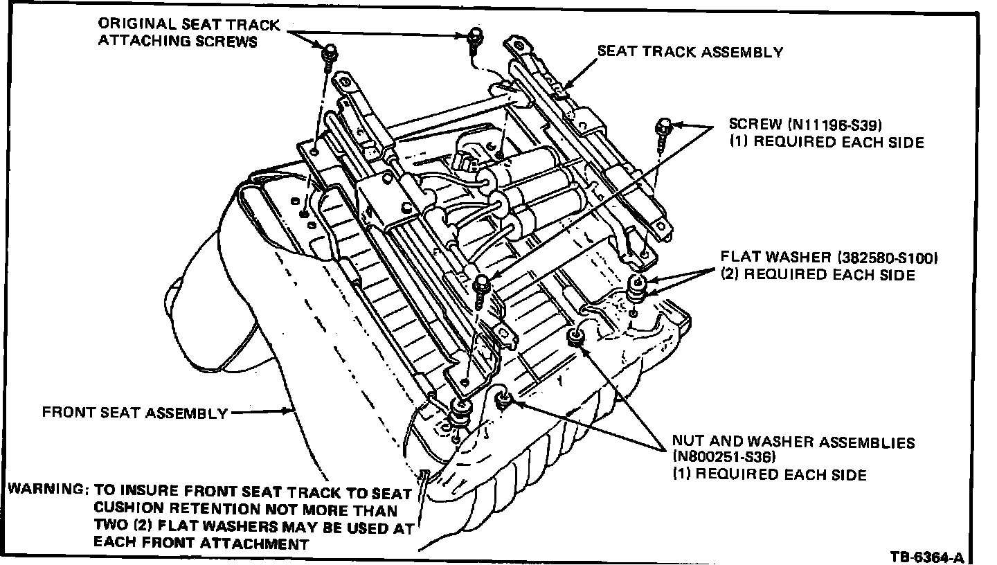 9. Install the specified longer attaching screws (N611196-S39) and nut washer assemblies (N800251-S36) at only the front seat track to cushion frame attachments. Install two (2) of the previously removed seat track attaching screws at the rear seat track attachments. (Figure 6) Torque the attaching screws and nuts to 12-24 N-m (9-18 ft.lbs.).