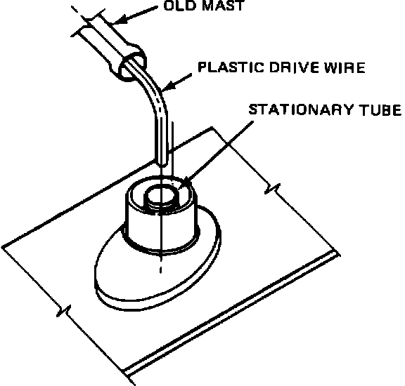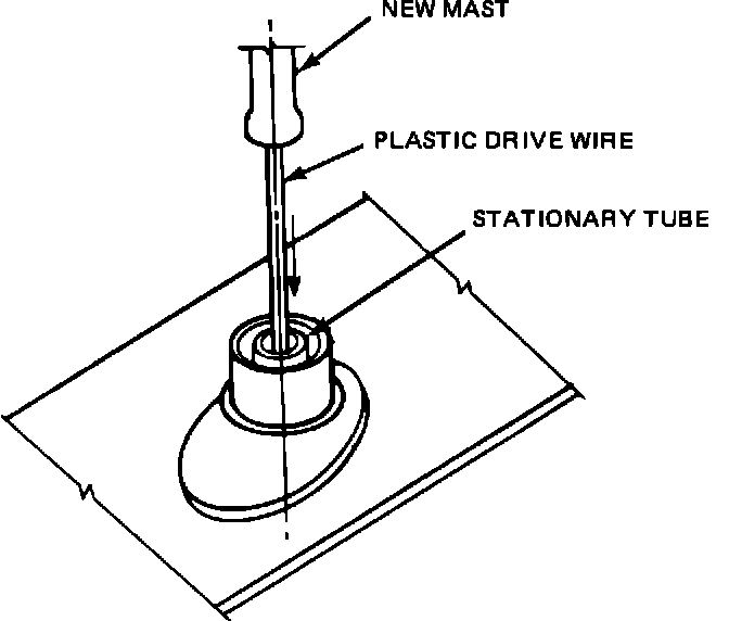 RUN THE MOTOR DOWN WHILE PUSHING DOWN ON THE PLASTIC DRIVE WIRE UNTIL APPROXIMATELY TWELVE INCHES OF THE PLASTIC DRIVE WIRE HAS BEEN DRAWN INTO THE STATIONARY TUBE. STOP THE MOTOR AND INSERT THE BOTTOM (LARGEST) END OF THE MAST INTO THE STATIONARY TUBE. RUN THE MAST DOWN.