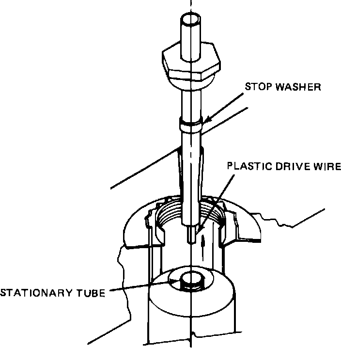 PUSH THE FREE END OF THE PLASTIC DRIVE WIRE FROM THE REPLACEMENT MAST ASSEMBLY INTO THE STATIONARY TUBE. WORK PLASTIC DRIVE WIRE AROUND UNTIL THE END OF THE PLASTIC DRIVE WIRE ENTERS THE DRIVE MECHANISM.