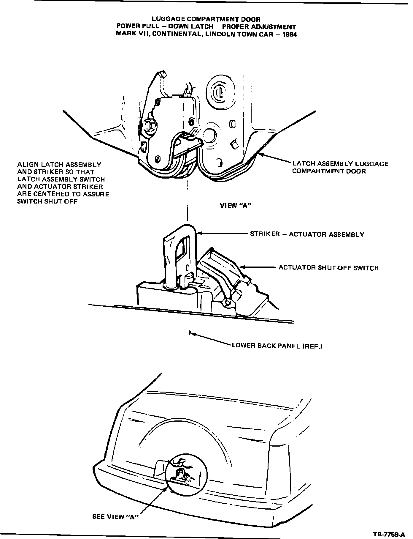 The luggage compartment power latch will relatch itself if the pop up distance of the luggage compartment door is inadequate, i.e., the door should have sufficient finger clearance to assure normal opening cycle, If the door opening is inadequate, the torsion rod tension should be increased in accordance with instructions shown in the 1984 Car Shop Manual, Volumes "A" and "B", Section 44-41.