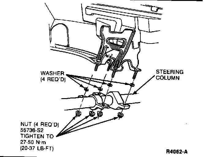 NOTE: When reinstalling steering column to support bracket, tighten the four attaching nuts to 28-50 N-m (20-37 lb.ft.).