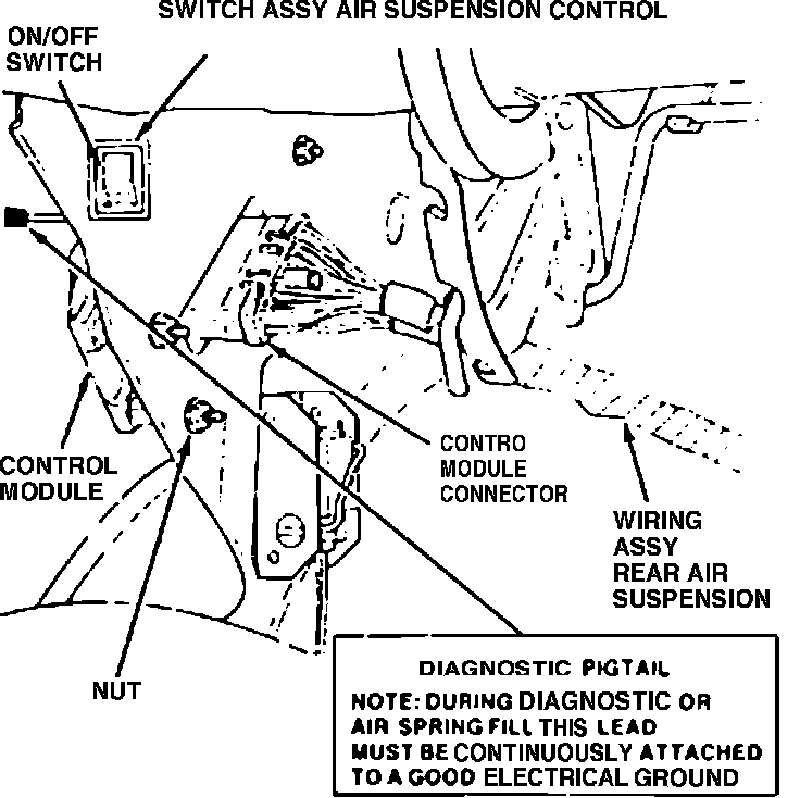 1. With suspension unloaded, turn air suspension switch to ON position, ensuring diagnostic pigtail is ungrounded. Lower vehicle, ensuring no load on the suspension.