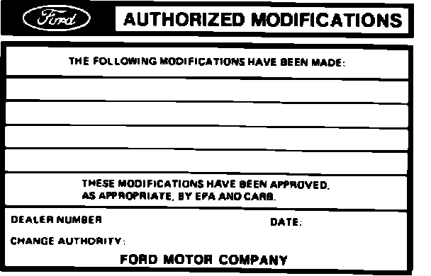 Obtain an Authorized Modifications decal and list the date, dealer number and summary of alterations performed. Select a prominent place adjacent to the Vehicle Emission Control Information decal suitable for installing the Authorized Modifications decal. Clean the area, install the decal and cover it with a clear plastic decal shield.