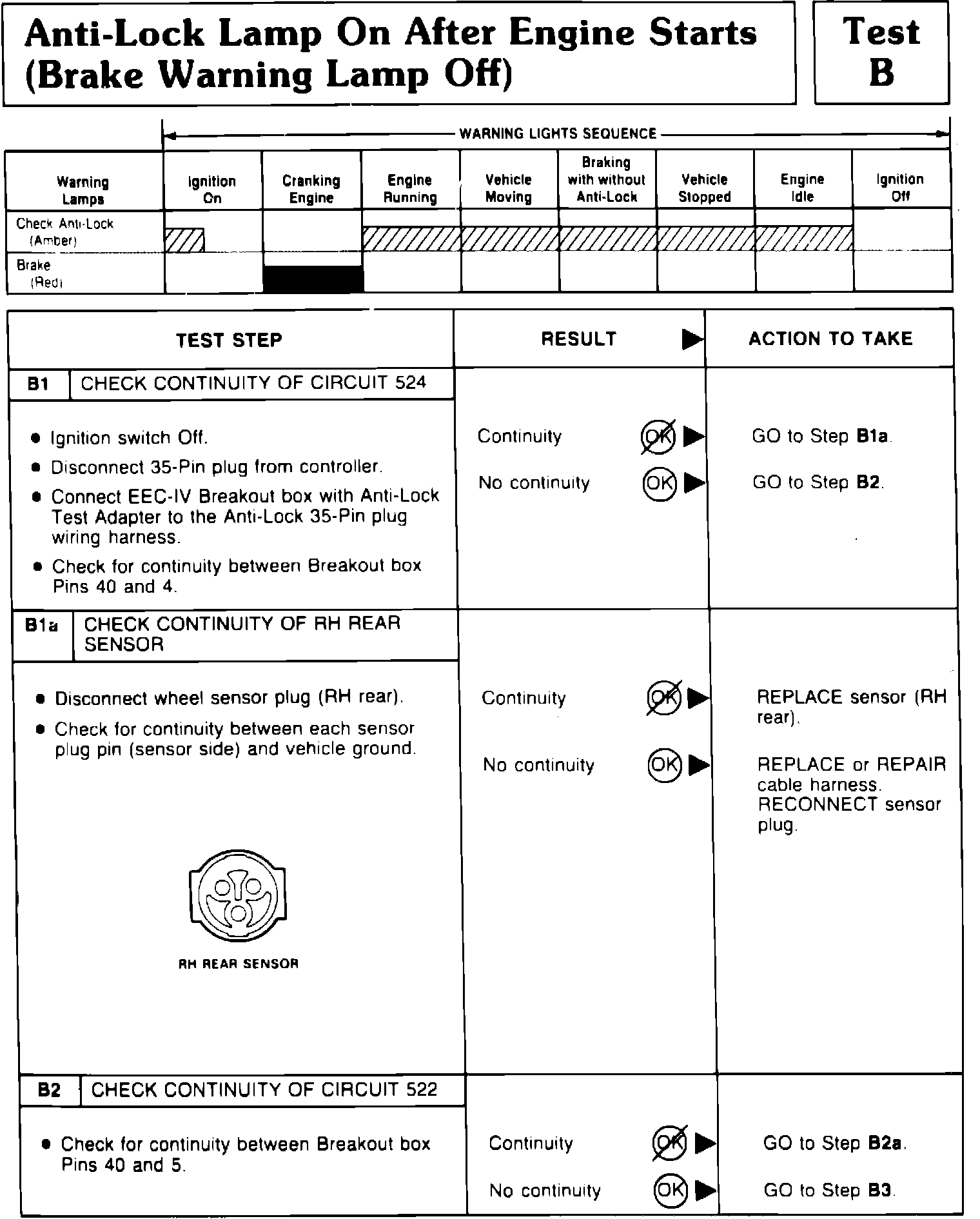 Fig. 37 Anti-skid diagnosis, anti-lock lamp ON after engine starts/brake warning lamp OFF (Part 1 of 3). 1986---87 exc. Thunderbird: