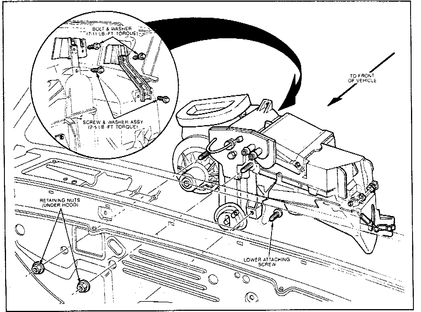 6. Working from passenger compartment, remove evaporator case support bracket to cowl panel attaching screw.