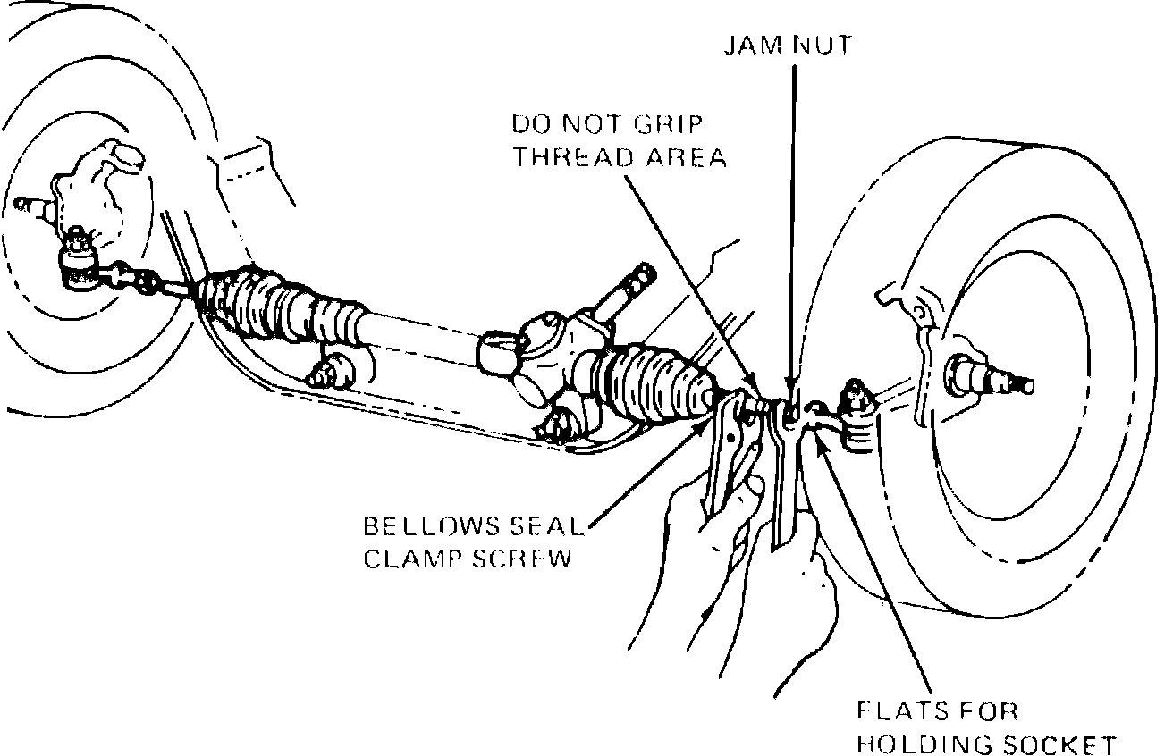 3. Place open end wrench on flats of tie rod socket to prevent socket from turning, then loosen tie rod jam nuts.