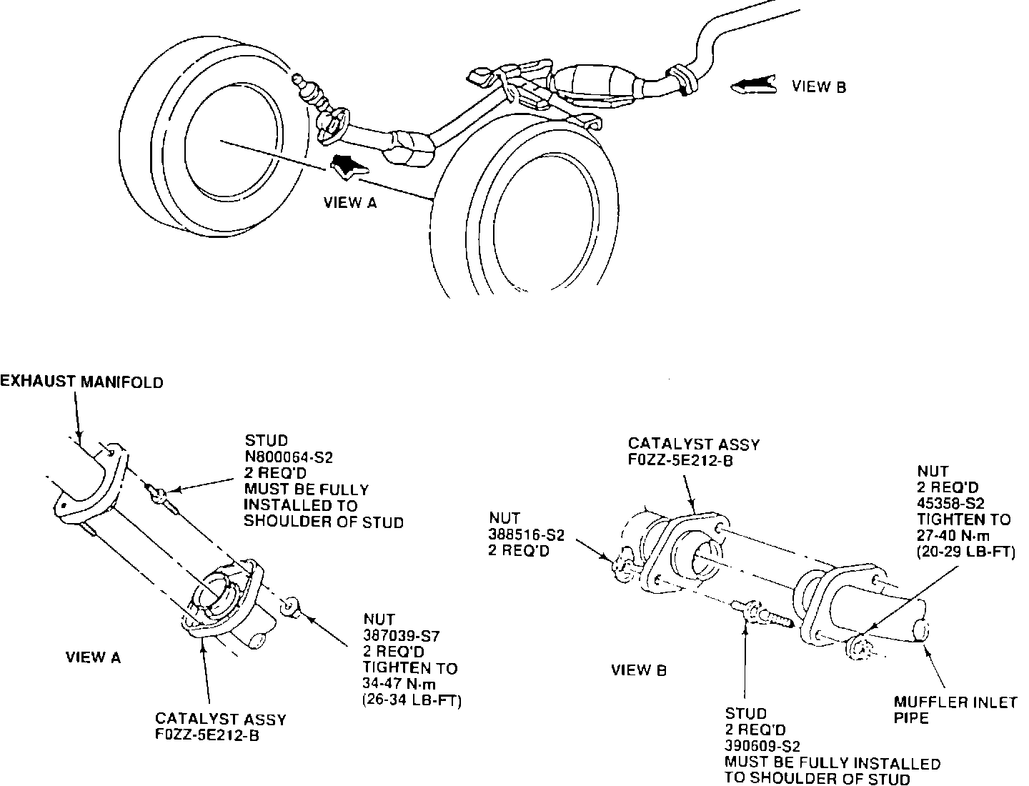 5. Remove wire support from muffler assembly and install muffler inlet flange to converter outlet flange. Loosely install retaining nuts.